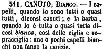 Canuto, Bianco - I capelli, quando lo sono tutti o quasi tutti, diconsi canuti; e la barba, quando lo è tutta o quasi tutta dicesi bianca, così delle ciglia e sopracciglia: uno o pochi capelli bianchi non fanno la canizie. [immagine]