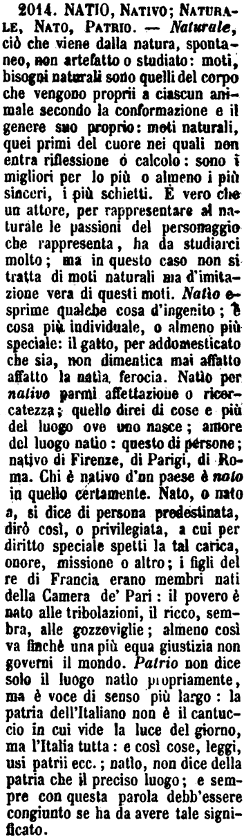 | Natio, Nativo; Naturale, Nato, Patrio - Naturale, ciò che viene dalla natura, spontaneo, non artefatto o studiato: moti, bisogni naturali sono quelli del corpo che vengono proprii a ciascun animale secondo la conformazione e il genere suo proprio; moti naturali, quei primi del cuore nei quali non entra riflessione o calcolo: sono i migliori per lo più o almeno i più sinceri, i più schietti. E' vero che un attore, per rappresentare al naturale le passioni del personaggio che rappresenta, ha da studiarci molto; ma in questo caso non si tratta di moti naturali ma d'imitazione vera di questi moti. Natìo esprime qualche cosa d'ingenito; è cosa più individuale, o almeno più speciale: il gatto, per addomesticato che sia, non dimentica mai affatto affatto la natìa ferocia. Natìo per nativo parmi affettazione o ricercatezza: quello direi di cose e più del luogo ove uno nasce; amore del luogo natìo: questo di persone; nativo di Firenze, di Parigi, di Roma. Chi è nativo d'un paese è nato in quello certamente. Nato, o nato a, si dice di persona predestinata, dirò così, o privilegiata, a cui per diritto speciale spetti la tal carica, onore, missione o altro; i figli del re di Francia erano membri nati della Camera de' Pari: il povero è nato alle tribolazioni, il ricco, sembra, alle gozzoviglie; almeno così va finché una più equa giustizia non governi il mondo. Patrio non dice solo il luogo natìo propriamente, ma è voce di senso più largo: la patria dell'Italiano non è il cantuccio in cui vide la luce del giorno, ma l'Italia tutta: e così cose, leggi, usi patrii ecc.; natìo, non dice della patria che il preciso luogo; e sempre con questa parola debb'essere congiunto se ha da avere tale significato. [immagine] |