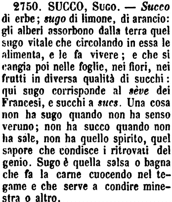 | Succo, Sugo - Succo di erbe; sugo di limone, di arancio: gli alberi assorbono dalla terra quel sugo vitale che circolando in essa le alimenta, e le fa vivere; e che si cangia poi nelle foglie, nei fiori, nei frutti in diversa qualità di succhi: qui sugo corrisponde al sève dei Francesi, e succhi a sucs. Una cosa non ha sugo quando non ha senso veruno; non ha succo quando non ha sale, non ha quello spirito, quel sapore che condisce i ritrovati del genio. Sugo è quella salsa o bagna che fa la carne cuocendo nel tegame e che serve a condire minestra o altro. [immagine] |